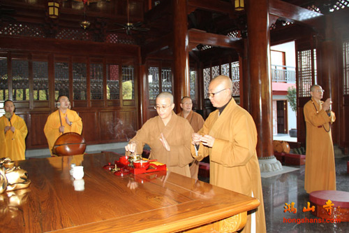 2014年11月15日,台湾慈法禅寺方丈、中华国际供佛斋僧大会主席净耀法师,净善法师及其护法弟子,净化社会文教基金会秘书长陈立纯居士等一行到访福建厦门鸿山寺,受到鸿山寺住持法云法师,监院普明法师、庚勤法师,知客庚诚法师等的热情接待。
