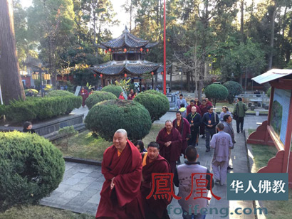 参加研讨会的法师与学者们在主办方的组织下朝圣鸡足全山。(图片来源:凤凰佛教)