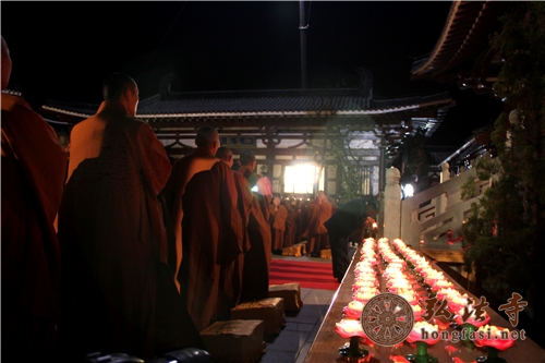 法会上人人手捧莲灯,从大和尚开始,依次点燃,众法师将手中的莲灯传至护法善信手中。点燃现场每位信众手中的灯,象征灯灯相传、愿愿相续。法会场面庄严感人,信众法喜充满,几百盏莲灯,共放光明。大家共同发愿回向:正法久住,国泰民安,世界和平。
