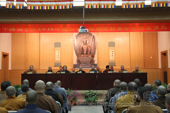 张厚荣副院长做了讲话。对杭州灵隐寺和盛荣房地产公司对中国佛学院的大力资助表示衷心的感谢!他指出,常言:“上有天堂,下有苏杭”,历来有“东南佛国”之称,此中杭州灵隐寺则享有盛名。而灵隐寺住持光泉法师在加强寺院建设的同时更是密切关注佛教的弘传与交流,承办讲经活动,兴办杭州佛学院。另外,更为中国佛学院连续五年设立图书资金及奖教、奖学金。张厚荣副院长又说,盛荣房地产开发公司总经理李九治先生,不仅热忠于慈善事业,更是对佛教有着深厚的感情,发愿连续十年为佛学院设立奖学金。我们将以此为契机,在新的一年里,更加努力工作,继续加强自身建设,努力提高教学质量,进一步发展中国佛教教育事业作为回报!