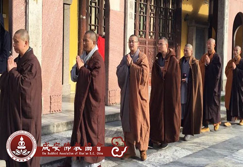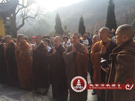 2014年12月12日(农历甲午年十月二十一)上午9点,宗贤法师、能诚法师、头鼎法师、玄磊法师、寂弘法师等从湖北咸宁大乘禅寺、无相寺起香,三步一拜到达九华山。自10月起香以来,五位法师历经两个月零一天圆满抵达九华山月身宝殿,心平法师、悟证法师、指月法师带领诸师与护法居士在月身宝殿前进行回向大法会。