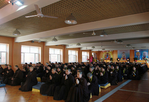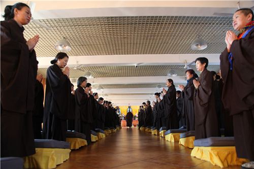 2014年12月20日,黑龙江大庆市果城寺2014年精进佛七及慈悲施食法会功德圆满。凌晨4时30分,夜色尚未褪去,参加法会的僧众莲友便随着清脆的板声,整肃后唱诵《赞佛偈》,投入到新一天的修行中。