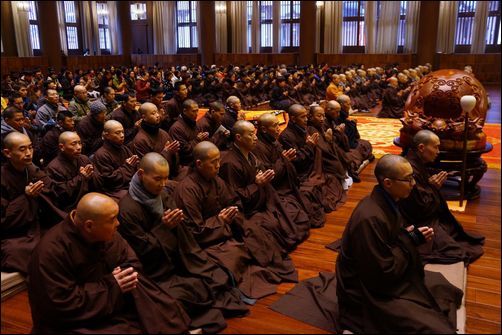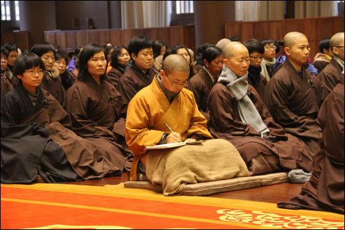 约四百余名四众弟子于灵山宝殿全神贯注地聆听法音