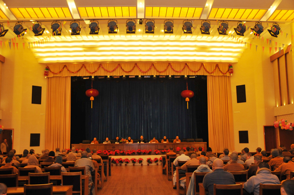 2015年1月8日上午9时,中国佛学院普陀山学院2014学年下半学期放假总结大会在国际会议中心礼堂举行,常务副院长会闲法师,教务长能进法师,副教务长宽度法师、照慧法师,院务办主任夏卫达,本科班班主任昭悟法师、慧贤法师,预科班班主任宗柱法师以及学院全体师生参加了会议,会议由宽度法师主持。