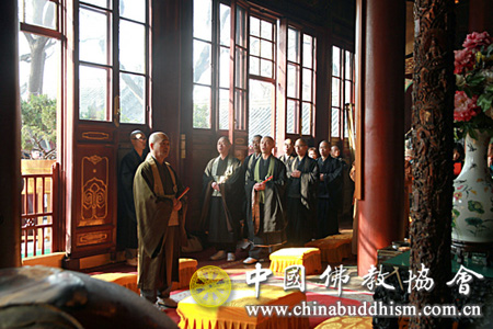 在中国佛教协会国际部主任普正法师、寺庙工作办公室主任清远法师等的陪同下,访华团一行首先在广济寺天王殿和大雄宝殿内诵经礼佛。随后,张琳副秘书长在广济寺怀远堂与访华团一行进行了亲切友好的座谈交流。
