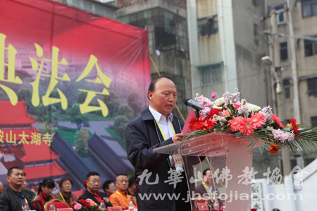 宿州市埇桥区宗教局局长钟西强首先致欢迎词:在这阳光明媚充满花香的好季节,迎来了宿州市地藏禅寺奠基法会,在此,我谨代表宿州市埇桥区,向不辞辛劳、拨冗前来参加庆典的各级领导、教内诸山长老、大德法师、护法居士表示热烈的欢迎和衷心的感谢。