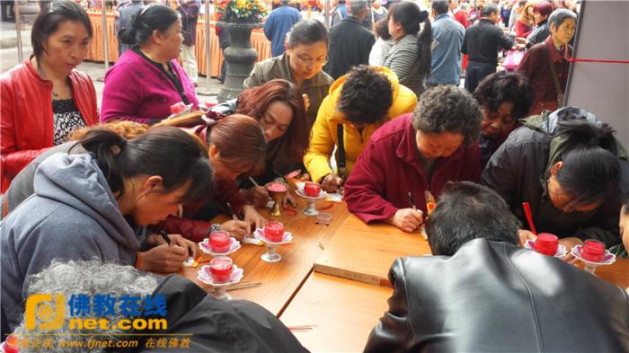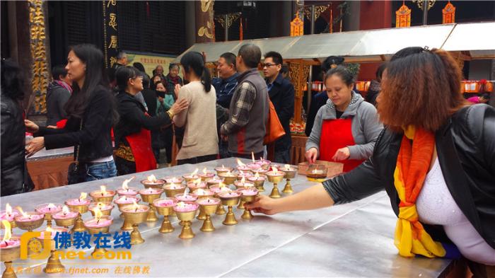 信众在藏经楼坛场前排队礼佛,供灯