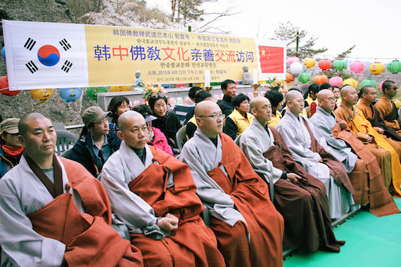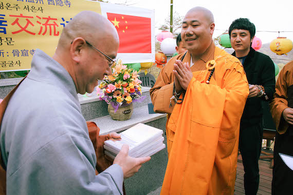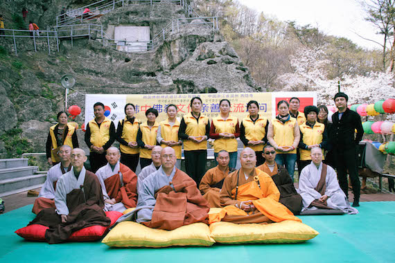 2015年4月12日下午2:00,温州西隐古寺住持智开法师一行来到位于韩国庆州、以禅武道闻名于世的骨窟寺,受到骨窟寺方丈、世界禅武道总联盟总裁寂云法师隆重而热烈的欢迎。寂云法师率两序大众在大殿前热烈欢迎智开法师一行,并发表了热情洋溢的祝词。智开法师也代表中国此次来访的[中韩国际禅修营]全体成员向寂云法师表示衷心的感谢。智开法师在答词中说:中韩佛教历来一脉相承,首足相连,佛法交流渊远流长。韩国庆州骨窟寺和温州西隐古寺,都是历史悠久的寺院,都肩负着传承祖脉、光大佛门的使命。希望两家寺院以后能够更多地增进了解,加强合作,为推动佛教文化的发展共同努力。智开法师还盛情邀请寂云法师来中国温州弘法,同时真诚希望两家寺院能以这次友好交流为契机,互结友好寺院。