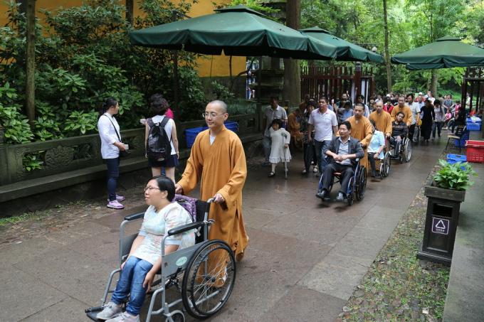 灵隐寺法师帮助重度脊髓损伤者走进灵隐寺