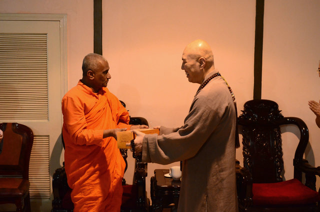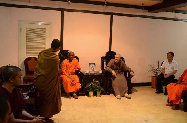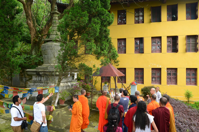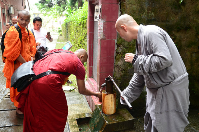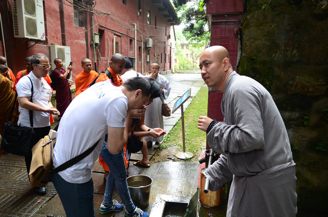 南传佛教的比丘参加东林寺僧众的午斋 体验汉传佛教寺院的过堂礼仪 大安法师为来访的客人介绍净土法门 穿白T恤的居士负责翻译 客人聆听 提问 大安法师回答 客人谈拜东林大佛的感受 大安法师赠送客人《白莲社十八高贤图》 大雄宝殿前合影 客人一行在大雄宝殿内用巴利文诵经 礼佛 东林寺知客师向客人介绍六朝松 介绍出木池 介绍护法力士的来历 客人参观聪明泉 用聪明泉沐手 现场品尝聪明泉 品尝聪明泉 用瓶子灌装 参礼佛驮跋陀罗尊者塔 寺院给客人结缘了净土法宝