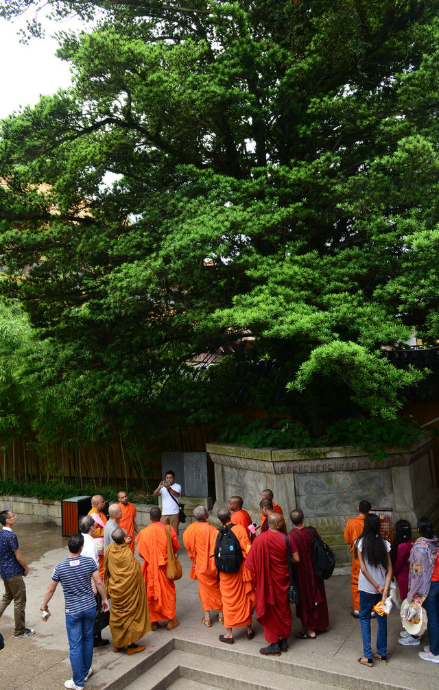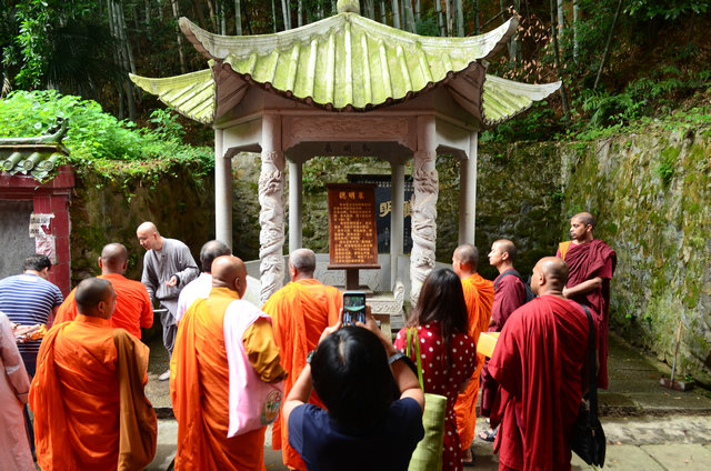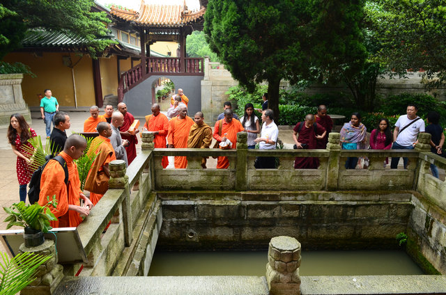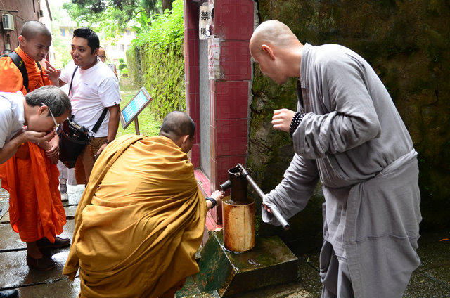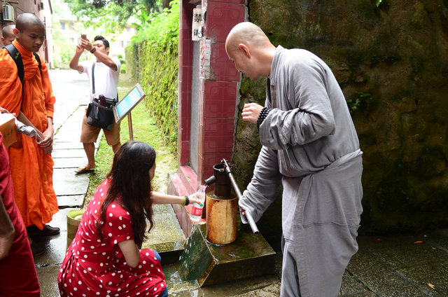 随后,客人一行入大雄宝殿礼佛,并用巴利文诵经。礼佛后,东林寺知客师带领大家参观了六朝松、出木池、护法力士石像,并讲解了它们的典故。参观聪明泉时,大家双手掬水现场品尝,或用瓶子灌装,大概是想让自己喝了后变得更聪明。最后,客人参礼了东晋高僧佛驮跋陀罗尊者灵塔。参访结束临走时,客人一行还收到了东林寺客堂赠送的净土法宝。