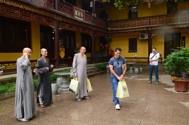 最后,大安法师赠送给客人一幅《白莲社十八高贤图》,并和大家在大雄宝殿前合影留念。