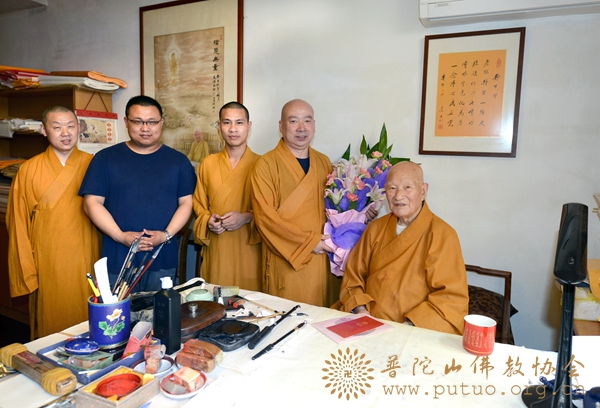 普陀山佛协委派正进法师(右二)一行慰问道生长老(右一)