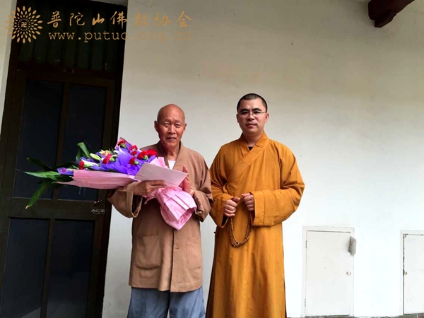 2015年6月23日上午,受浙江省普陀山佛教协会会长道慈法师委托,普陀山佛教协会副秘书长兼办公室主任正进法师,办公室副主任常慈法师,办公室干事门仁法师、吉波法师等一行,前往普济禅寺、普陀山佛教颐养堂杨枝禅林和常乐禅院,分别为普陀山佛教协会咨委会主席道生长老庆祝94岁寿诞, 颐养堂印参长老庆祝82岁寿诞及新定长老尼庆祝82岁寿诞。法师们转达了道慈法师的诚挚问候,并与长老家们合影留念,祝愿长老们健康长寿,吉祥如意,并送上鲜花、贺卡及贺仪。(文:门仁 图:门仁、昌其)