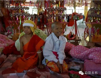 不仅父亲家忙,干爹(教父)家也同样忙得不可开交,而准和尚则要在这一天进行剃度仪式。此次曼岭出家的7个小男孩年龄从9岁到12岁不等,其中最小的两位是一对可爱的双胞胎兄弟,问及为何出家时,哥哥羞涩地说,因为弟弟想出家,他怕弟弟一个人孤单没有伴所以陪他出家。真是中国好兄弟啊,小编瞬间被兄弟俩感动萌化到不行~