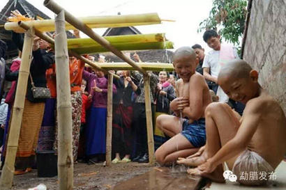 人们认为为小和尚沐浴是大福大运之事,人人都要参与,谁都想为“鲁教”尽心意,从中纳福。所以,在沐浴圣水的圣浴上需要用芭蕉杆和竹竿搭建一个引水槽,信众整齐有序的排好队伍在上方倾泻圣水,“鲁教”通过引槽导流的圣水接受信徒沐浴,沐浴环节有条不紊地进行着,谁都不愿错过给“鲁教”“圣浴”的机会。