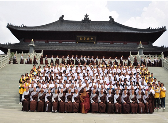 开营典礼结束后,如瑞法师与参加本次妙吉祥文化夏令营的全体成员,在大雄宝殿前合影留念。