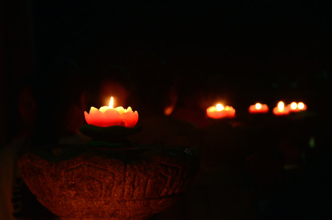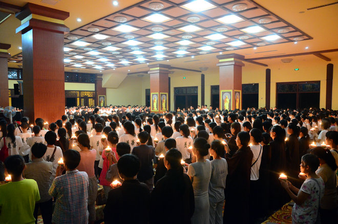 在接下来的传灯法会中,大安法师点亮了第一盏莲花灯。而后,各位出家师父和营员手中的灯次第点亮。德凯法师带领营员读诵《供灯发愿文》。在朗朗佛号声中,营员们手捧莲灯,走出香光讲堂,到大雄宝殿前供灯。愿点点灯光照亮在场每个人的心灵,带领我们走向美好的未来,走向生命的圆满与解脱……