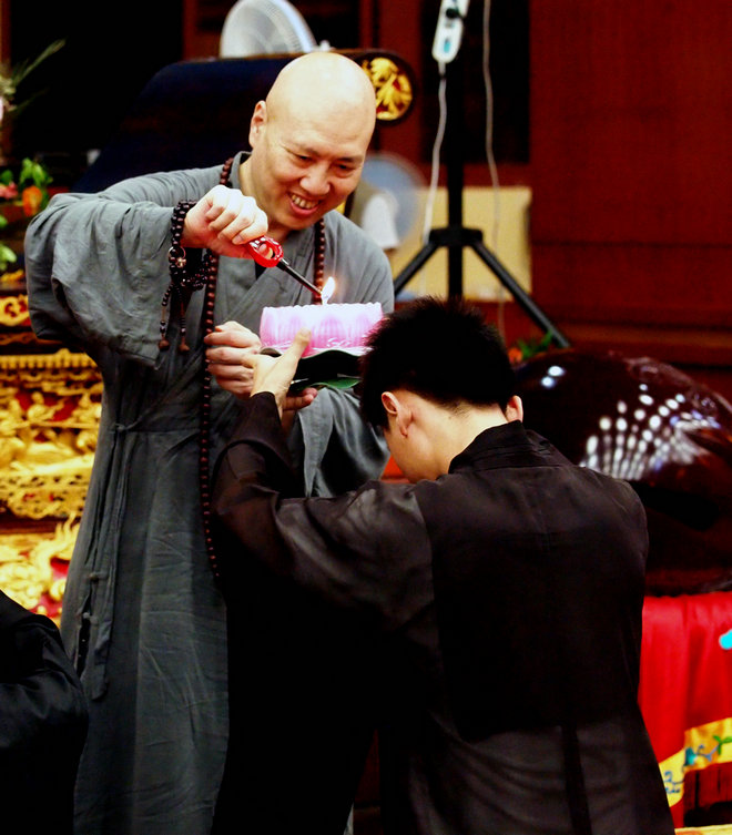 德凯法师宣布演出开始 慧度法师致辞 张居士代表居士辅导员主持节目