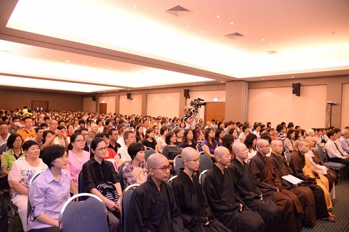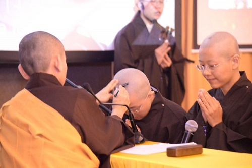 上午10点30分左右仪式正式开始,首先维那、和尚尼和阿阇黎入场引领大家唱诵《炉香赞》,继而由引领师引导行者入场礼佛。行者作礼常跪、合掌,一一请师剃发,并在声声“流转三界中,贪爱不能脱,舍俗入无为,真实报恩者” 的梵音中步向父母面前,至心感恩父母的恩德、辞拜父母。阿阇黎接着策导他们如何发心做个真正的出家人,再往佛前礼拜十方佛说《皈依偈》,阿阇黎说:“剃除蓄发为了舍弃骄慢,身披袈裟为去除世间贪爱,就跟诸佛的清净幢相无二无别,所以应该深深随喜。”和尚尼继而教诫四位行者这一生要好好做个出家人,以后无论发生什么事情,决志出家,永不退心。四位行者高喊:“决志出家,永不退心”后,和尚尼分别为他们一一落发、传授袈裟、赐法名字号。四位修行人的法名分别是:何淑娟为延福,字号祖广;蔡宜姗为延德,字号祖宏;彭筱慧为延智,字号祖圣;洪莞尔为延慧,字号祖道,代表为圆满福德智慧、广宏圣道的决志。