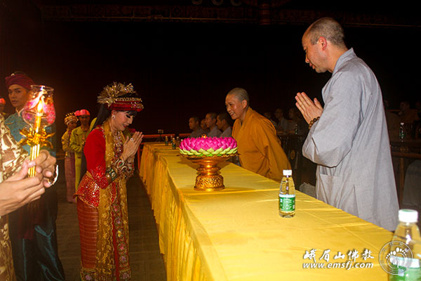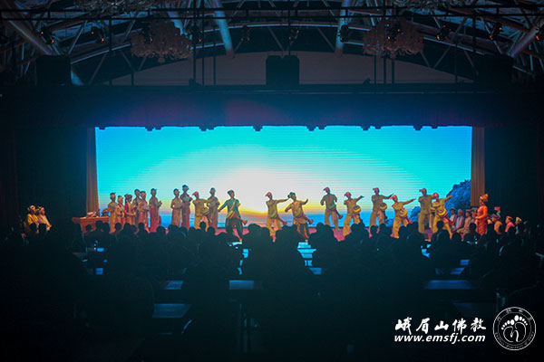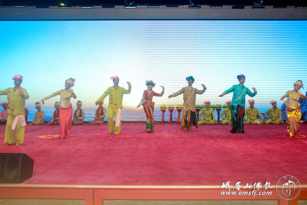 19日晚,为加强中泰两国佛教界的文化交流,参访团在大佛禅院峨眉讲堂演出了一场泰国舞剧,郡主本人亲自上场表演,优美的舞蹈、异域风情的服装及音乐,展示了泰国悠久的历史文化,受到观众们的热烈欢迎。心定副会长、演法副会长观看了演出并与郡主互赠礼品。