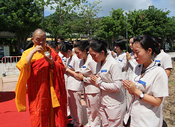上午11时,洒净祈福法会由南山寺坚悟法师主法,海南三亚南山功德基金会副秘书长吴元杰、南山寺僧众与海上观音道场居士共同参加祈福法会。法会现场梵呗悠扬,吉祥殊胜,引来十方善信、游客驻足共沾法喜。