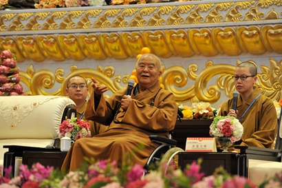 大师以智仁勇“三达德”、菩提心、慈悲心、般若心,说明两岸慈悲有通路,希望大众当仁不让。并以“白云守端禅师悟道因缘”、“双鬼争尸”等禅门公案,说明智慧与慈悲的重要。大师强调两岸包容、同体共生,相信藉由慈悲思路,将可觅得两岸出路。“以智慧、忍耐、勇敢、智仁勇为依循,无论是面对人我问题、或是两岸问题,均能迎刄而解。”大师又以“佛像与大罄的对话”提醒大众,佛像因为雕刻过程中,历经千锤百鍊,才能成为佛祖,让信徒以恭敬心上香、献花果。大师也赞扬现场佛光人、嘉宾一心一意参与整天活动,乃是中华文化的升华。此外,大师特别感谢宜兴市委书记王中苏对大觉寺的护持,让全世界人士都拥有宜兴的名片“大觉寺”。