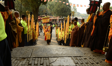 仪仗队引领法师至山门
