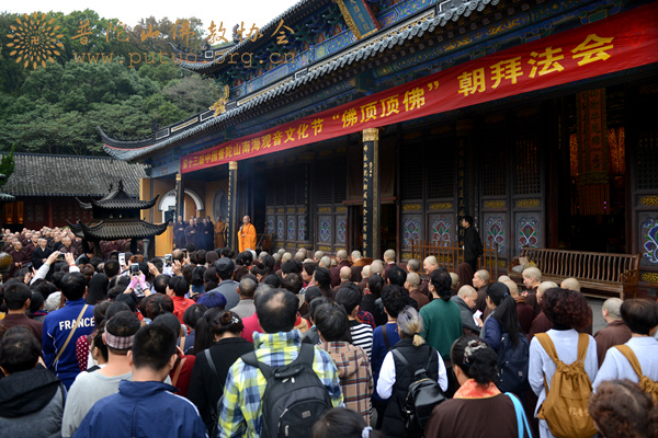 2015年11月12日上午,普陀山法雨禅寺至慧济禅寺的香云路上,作为第十三届中国普陀山南海观音文化节系列之一“僧尼礼佛顶、万信齐朝拜”——佛顶顶佛朝拜法会在这里隆重举行。来自全山各寺院的僧众和护法居士、以及部分来山的香游客300余人,于上午7时齐聚法雨禅寺大雄宝殿前,朝拜法会正式拉开序幕。普陀山佛教协会副会长、法雨禅寺监院信光法师主持法会。