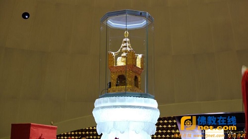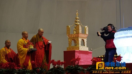 大初法师宣安奉法语,托举舍利走上供奉台