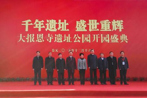 上午10时30分,南京大报恩寺遗址公园正式开放,开园仪式上,南京市市委书记黄莉新、南京市市长缪瑞林与“大报恩寺重建第一捐赠人”的万达集团董事长王健林等人士共同见证了南京又一佛教文化地的诞生。