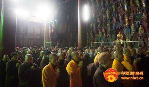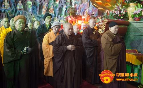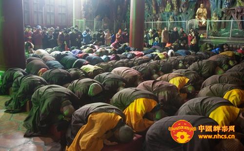 早殿之后,两序大众依次到祖殿礼拜六祖,于天王殿礼拜弥勒菩萨,随后回到大雄宝殿向传正大和尚、诸位班首师父及大众师父拜年。