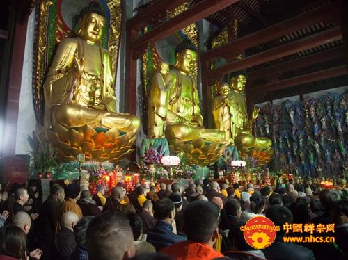 今天是农历正月初一,新年伊始,南华禅寺举行2016年新春吉祥祈福法会。晨钟初鸣,在接近零度的气温下, 大雄宝殿门口就已站满了各地而来等待祈福的信众。4时许,南华禅寺常住法师在钟声中陆续进殿依次排班站立。祈福法会由南华禅寺方丈传正大和尚主法。