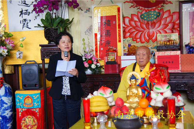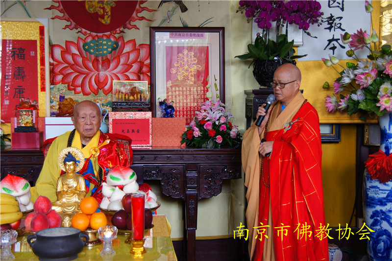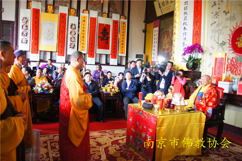江苏省委统战部副部长、江苏省宗教局李国华局长,南京市委统战部副部长、南京市民族宗教事务局李兰局长、纪勤副局长;中共栖霞区委邢正军书记,栖霞区人民政府常务副区长曹海连,副区长万震;栖霞区政协副主席、区委统战部长时效俊等领导也莅临现场,恭贺长老寿诞。