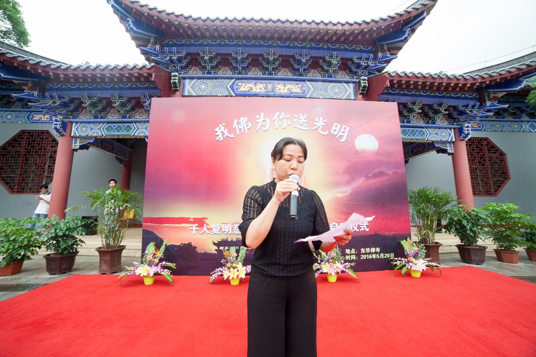 祈福大典完毕后,白内障慈善公益活动启动仪式于东华禅寺家风广场举行。出席本次启动仪式的领导和嘉宾有:翁源县民宗局局长张慧霞女士,翁源县残疾人联合会理事长陈初华先生,东华禅寺方丈万行法师,本次活动的主要发起人“眼健康管家”创始人刘庆女士,韶关市第一人民医院眼科主任袁洁女士,来自企业届的代表广东喜联企业管理有限公司董事总经理安艳伟,以及来自南方都市报、南方农村报、南方日报、大粤网、凤凰网、南方网、韶关电视台、韶关日报、翁源电视台的媒体朋友。张慧霞局长在讲话中表达了对诸位嘉宾及参与者的衷心感谢:“你们把爱心和光明送给了我们翁源百姓,给他们带来了实实在在的利益,我代表他们感谢你们!”万行法师也表达了对各界爱心人士的感谢:“正如佛法是在各种因缘和合下才现世的,此次活动也是在韶关市第一人民医院,‘眼健康管家’,翁源县民宗局,翁源县残联,还有众多企业家、媒体以及善信的支持下促成的,众种因缘的和合才给了东华寺这次做善事的机会,对此我表示万分的感谢。”