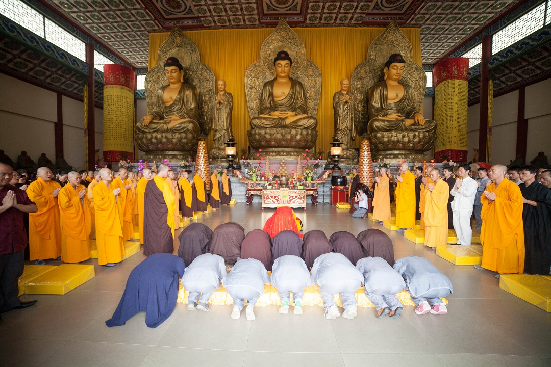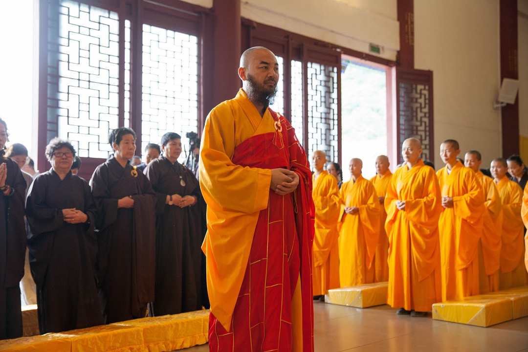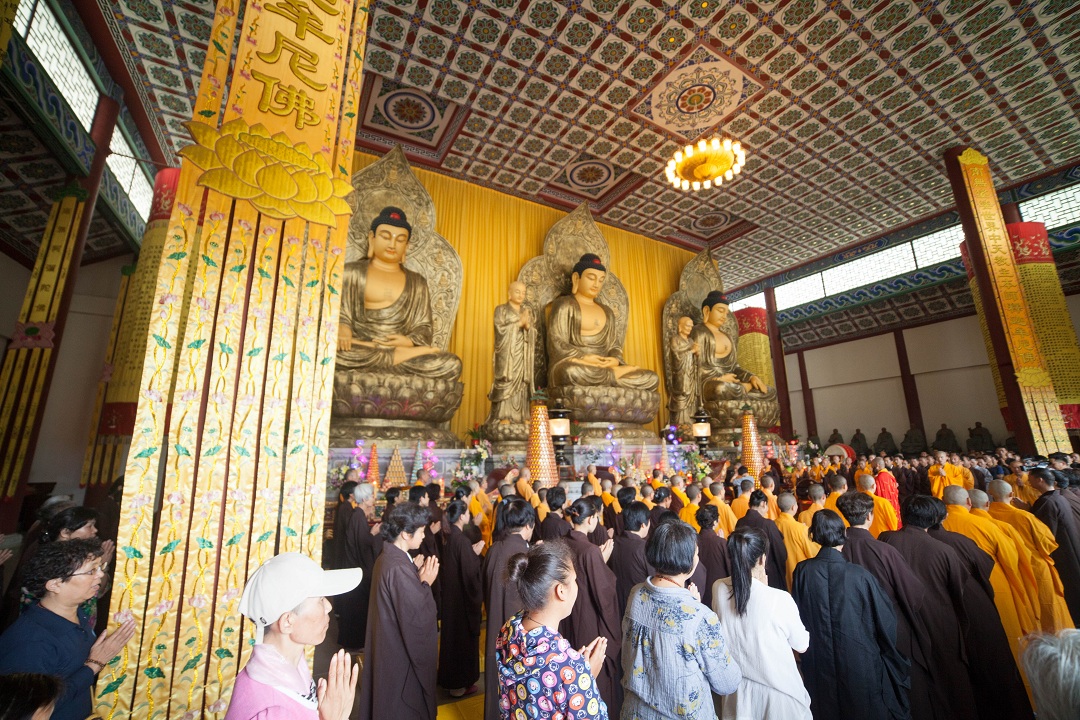 大雄宝殿内挤满了参加祈福大典的法师和居士