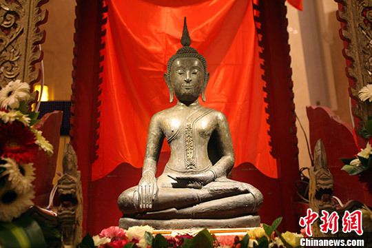 日前,在昆明举办的2016澜沧江-湄公河次区域国家商品博览会“海上丝绸之路与郑和论坛”上,泰国参会方特向泰国文化部申请,把泰国600年的国宝铸有“三宝公化金身”佛像迎请到展会,并向公众展示。