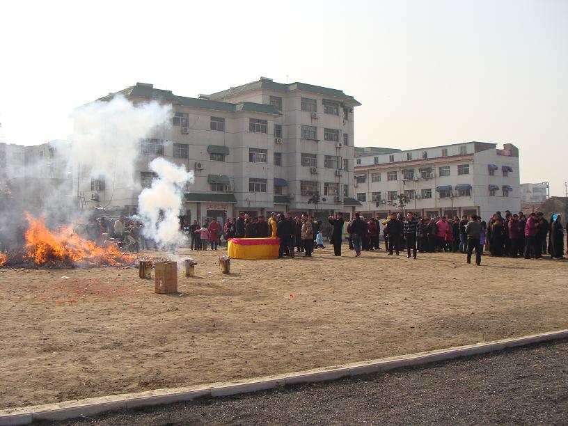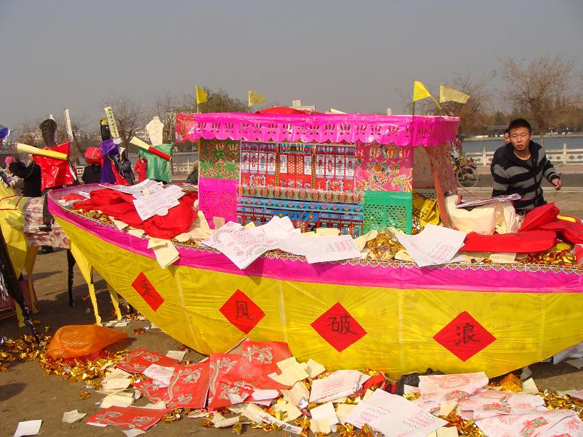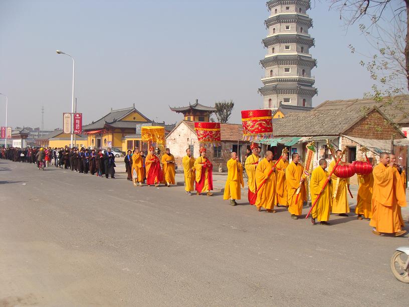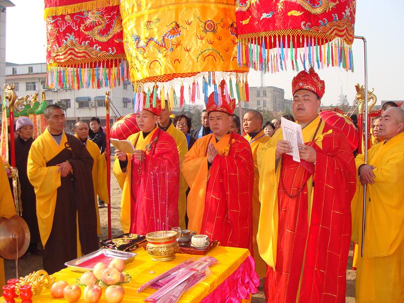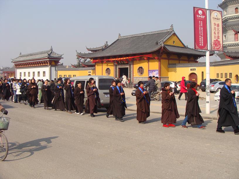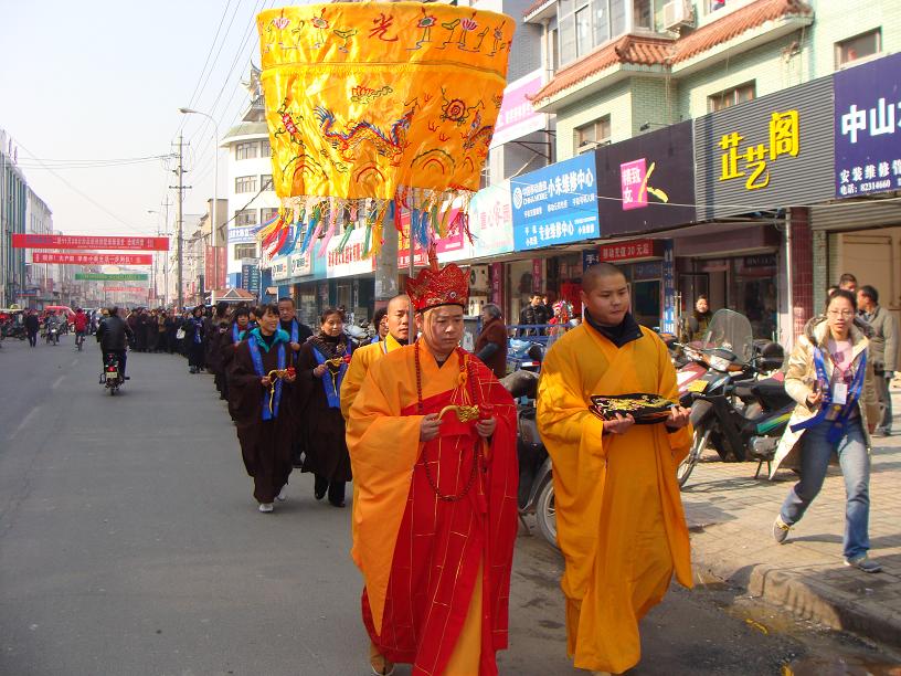 送圣队伍浩浩荡荡,走出山门,沿着涟城中山路东行,延伸足有500米长,引来了众多围观者和信众的瞩目赞叹。最后抵达涟水实验小学外边的操场空地上。只见镇坛大将军手持“慈航普渡”和“镇守坛前”的幡旗巍然立在送圣地点。镇坛大将军的后面是一艘纸糊的西方大船,船边堆满了纸折的莲花和金元宝。众僧列队面对镇坛大将军和西方大船,一起唱诵,并把二十四席牌一一放到西方大船里,三位法师率众僧及信众起腔念诵,与此同时,鸣放鞭炮,点燃西方船,祈愿镇坛大将军护持西方船上的所有亡灵顺利前往西方极乐世界。持续大约一个半小时,水陆法会送圣仪式圆满结束。