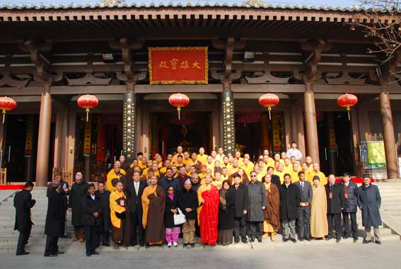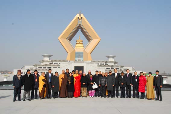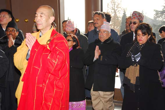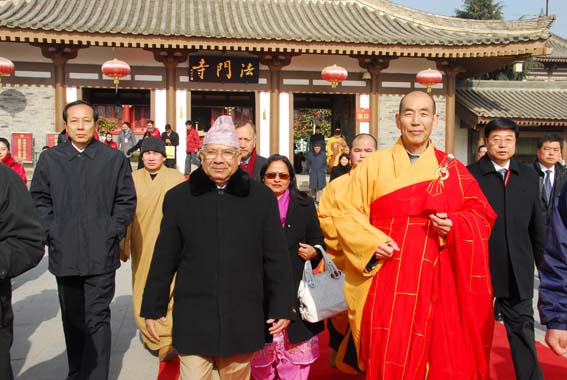 2009年12月28日,法门寺广场地铺大红地毯,僧众列队站立两侧,11时尼泊尔总理马达夫·库马尔·尼帕尔、随团来访的有总理夫人、副总理兼外长、财政部长、能源部长等一行30余人,在中国驻尼泊尔大使邱国洪等人员陪同下来到法门寺参拜佛指舍利,受到法门寺两序大众热烈欢迎。法门寺智超法师、来正法师、果清法师、洪利法师、智雄法师、慧慈法师分别向总理介绍了法门寺的历史、现状及未来努力的方向。(文:果清)