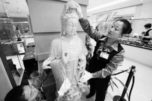 工作人员在对“翡翠观音”进行开展前的最后擦拭
