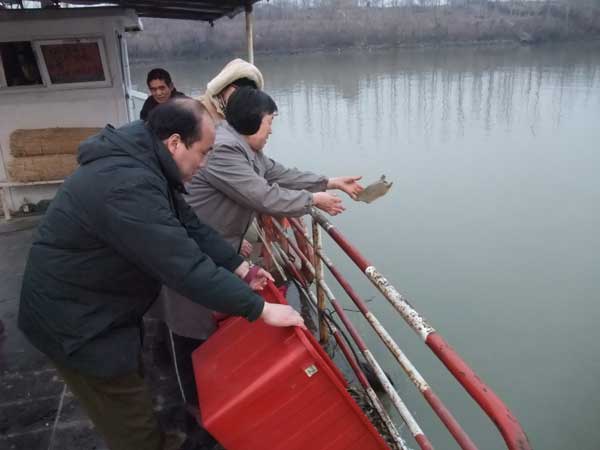 这天早上6点钟,江苏徐州兴化寺方丈果光大和尚委派监院常信法师带领众居士,在段庄菜市场,购买了1.5万元的鲜活长鱼、甲鱼、黑鱼、泥鳅等,冒着零下4-5度的风寒,赶到大运河畔,由常信法师带领众居士举行完放生仪式后,将几万尾鲜鱼放归波浪滚滚的大运河。