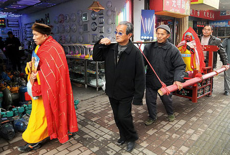 2月1日,一队人马抬着一座“神像”敲锣打鼓沿着黄石市黄石大道上窑一带“化缘”。据他们自己介绍,他们是黄石市花湖一座庙里的,抬着“神像”敲锣打鼓是为了给庙里“化缘”。据湖北省佛教协会会长正慈法师介绍,和尚只能待在庙里做法事,不允许上街“化缘“,上街“化缘”不是真和尚。(稿源:新华网)