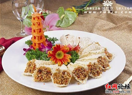 皇寺极臻——万佛祥光宴 四大名山 虫草花炖灵芝 极品佛跳墙 浓汤木瓜盅 踏雪寻参 菩提正果 静心珍珠粒 极品羊肚菌 碧绿炒双珍 清炒芦笋 萝卜丝酥饼 槟榔 香芋 蜂王炖雪莲 法门福饺 什锦素面 精美果盘 18888元一桌 膳缘居