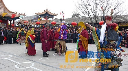 僧众诵经祈愿后,一个魔鬼形象的“巴令”被抬出,信众们纷纷用哈达扫满全身并将沾满晦气的哈达献于“巴令”,并从“巴令”下钻过,喻意晦气、灾病被带走。僧众穿上奇特的装束进行“打鬼”的舞蹈跳恰。跳恰过后“巴令”被抬出山门用火焚烧。
