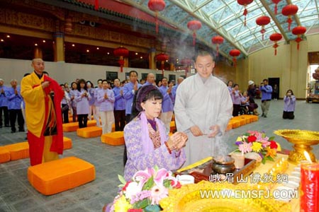 迎佛仪式由峨眉山佛教协会常务副会长传智法师主持,丽善郡主与数十位泰国信众和峨眉山的法师们一起,诵念祝祷,虔诚礼拜,仪式如法如律,庄严神圣。随后,受峨眉山佛教协会会长永寿法师的委托,传智法师代表峨眉山佛教协会向丽善郡主一行致欢迎辞,对他们的善愿善行给予了高度赞扬。