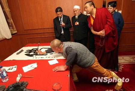 3月10日,在全国政协宗教界委员小组讨论会上,全国政协委员、九华山佛教协会会长慧深现场展示“功夫书法”夺人“眼球”。