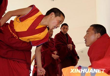 云南佛学院迪庆藏传佛教分院的学僧在辩经 (图片来源:新华社 蔺以光摄)