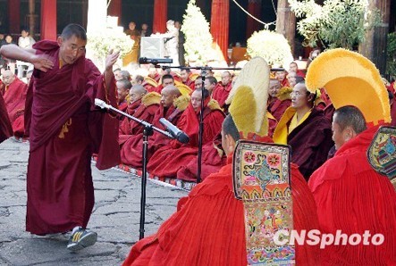 立宗答辩仪式结束时,按照传统宗教惯例,所有参加答辩仪式的僧人集体诵经祈祷释迦牟尼,色拉寺领经师嘎玛领诵经文。