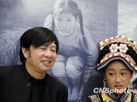 图为在“汶川娃”油画宣传品前,作者李自健和画中人物、来自汶川的少女在一起。(图片来源:中国新闻网)