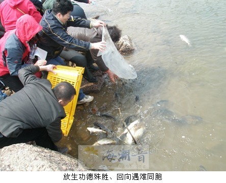 2010年4月18日,辽宁省大连市观海寺举行大型放生法会,为青海省玉树地震灾区祈福,放生功德回向在玉树地震中遇难同胞的亡灵,祈愿灾区有情众生早日脱离苦难,祈祷世界和平、人类安康。(图、文:虚实)